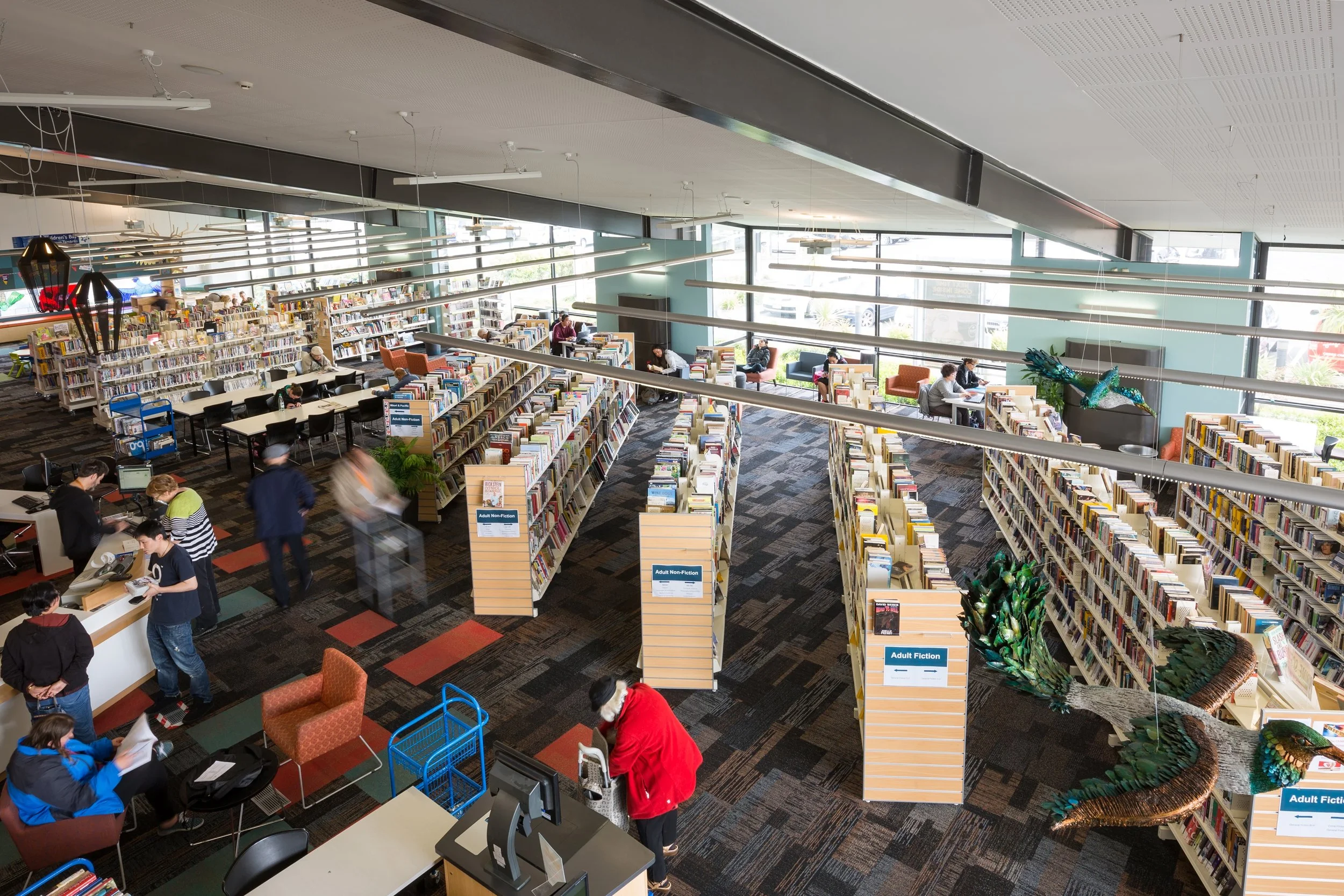 A key element of the refurbishment of New Lynn Library was a reorganisation of the layout, with shelving realigned to open up the library and create visibility through to the exterior environment. The previously solid bulk of the service desk was lightened through the creation of a new breathable, interactive service zone.
